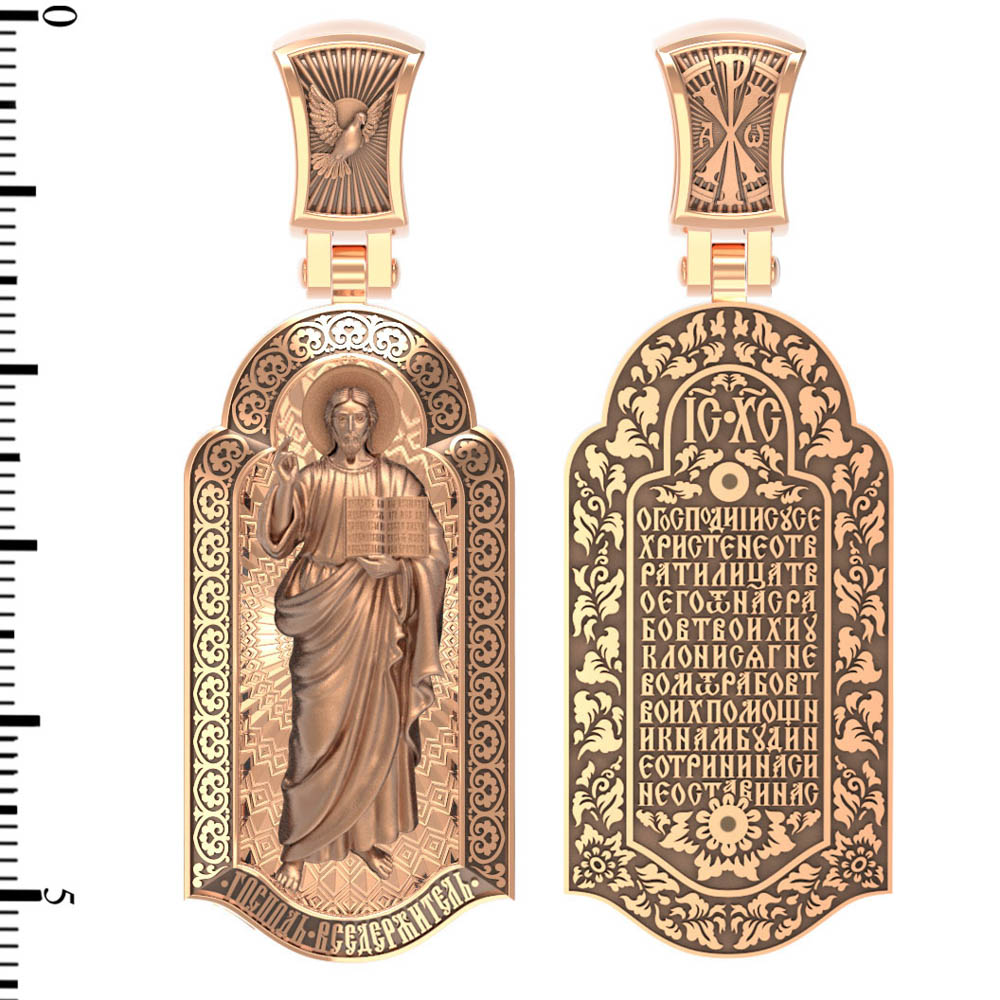 На лицевой стороне креста изображен Иисус Христос в образе Вседержителя, по-гречески «Пантократор». Это древнейший образ Спасителя, на котором Он представлен как властелин и правитель мира. Христос держит в руках Книгу, которая символизирует Книгу Бытия, то есть весь сотворенный Богом мир. В этой Книге судьбы всех людей, живущих на земле. Часто эту Книгу образно называют Книгой Жизни. Первое дошедшее до нас подобное изображение датируется VI веком и хранится в монастыре Святой Екатерины на горе Синай. Такие образы Христа с глубокой древности писались и в Палестине. Но Святая земля так часто подвергалась разграблению завоевателями, что древних икон там не осталось. Большинствоикон в храме Воскресения Христова были созданыв XIX веке.
