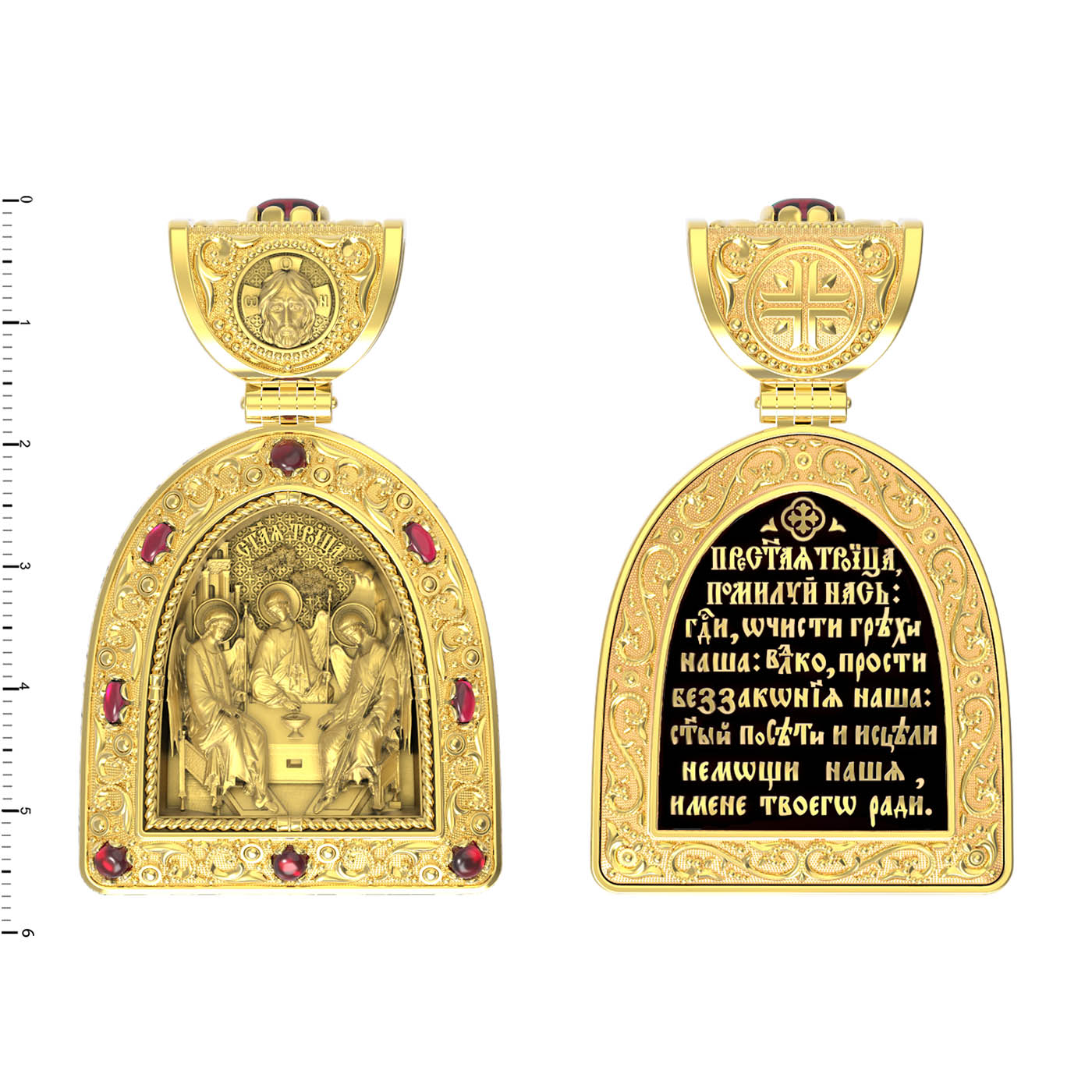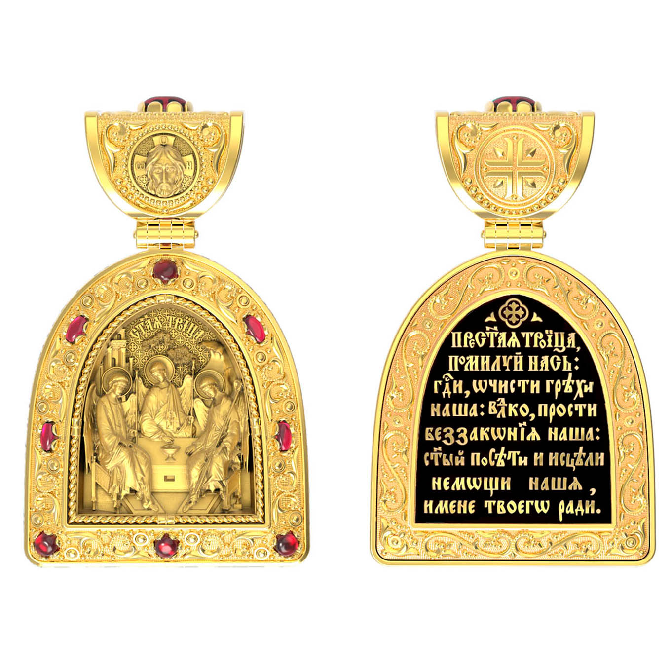 Основой композиции лицевой стороны является икона Святой Троицы.