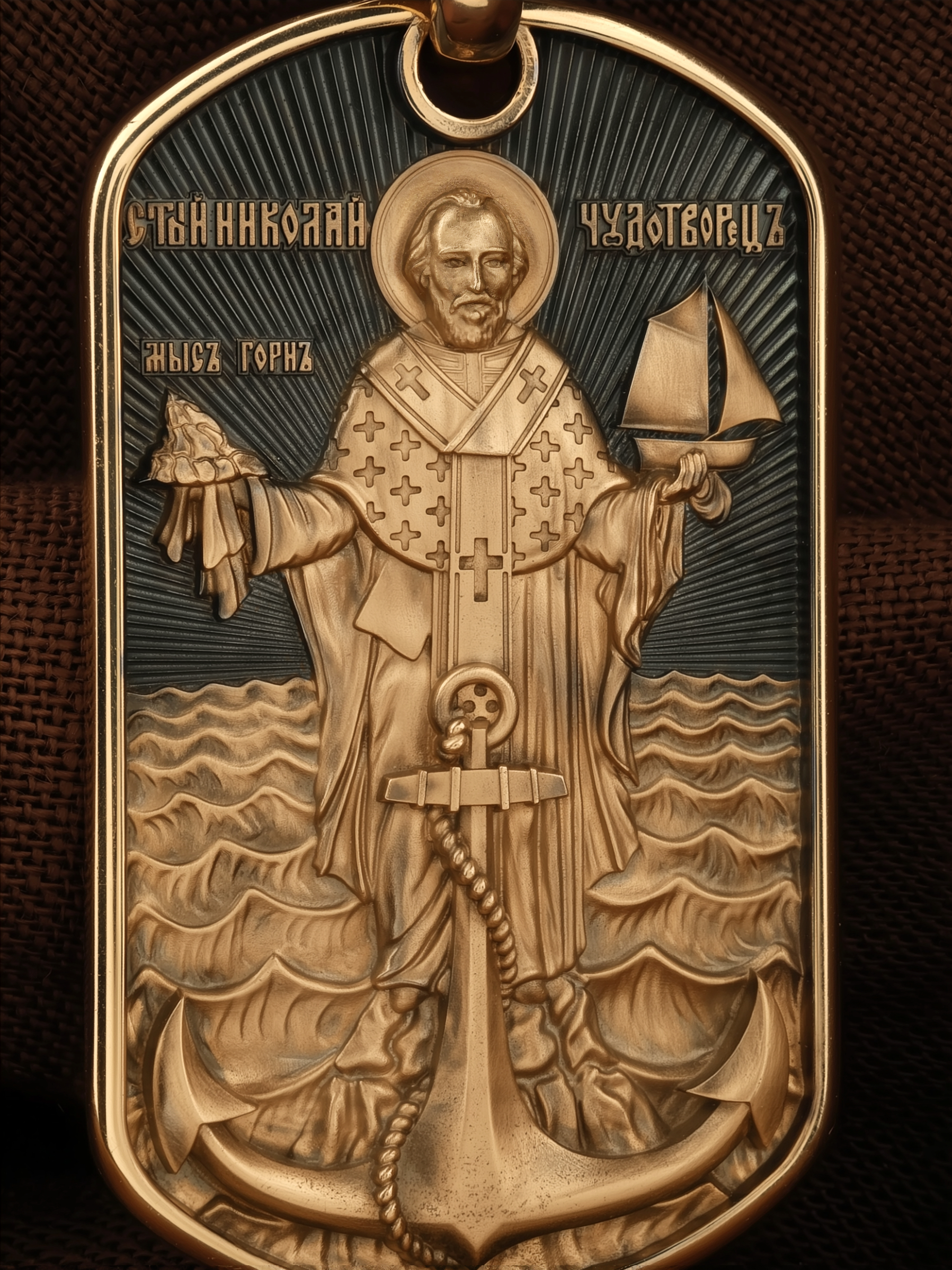 Лицевую сторону возглавляет икона Святителя Николая Чудотворца. Живший в III веке епископ Ликийского города Миры — самый почитаемый святой не только в России, но и во всем мире. Николай Чудотворец, помощник в делах, покровитель учащихся, утешитель обиженных и нуждающихся, целитель самых страшных и тяжелых недугов, предстатель и молитвенник за людей перед Богом. Также Святитель Николай Чудотворец известен своими молитвами за путешественников, когда непрестанный ветер и бушующие волны утихают и корабль заходит в спокойную гавань.