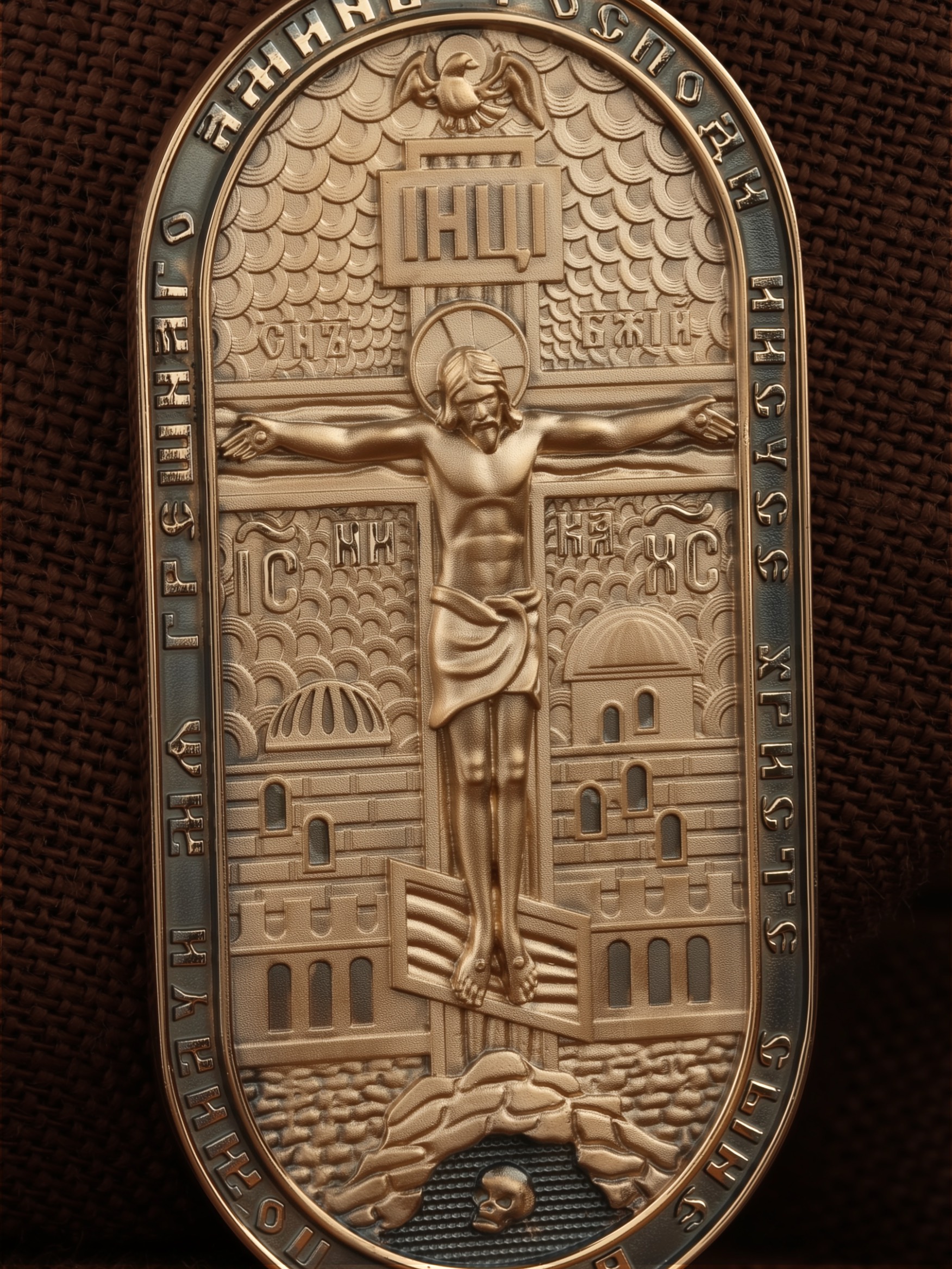 Центральную часть лицевой стороны занимает Распятие, потому что это орудие казни Иисус Христос сделал орудием победы над грехом и смертью. Своими страданиями Он искупил грехи человечества, умерев и сошествовав во ад, победил сатану, освободил души праведников от вечной смерти и открыл им небесные врата рая. Жертва Христа сделала возможным спасение для каждого человека. На православном кресте Христос не умирает, а свободно простирает руки, ладони Иисуса открыты, будто он хочет обнять все человечество, даря им свою любовь и открывая путь к вечной жизни.