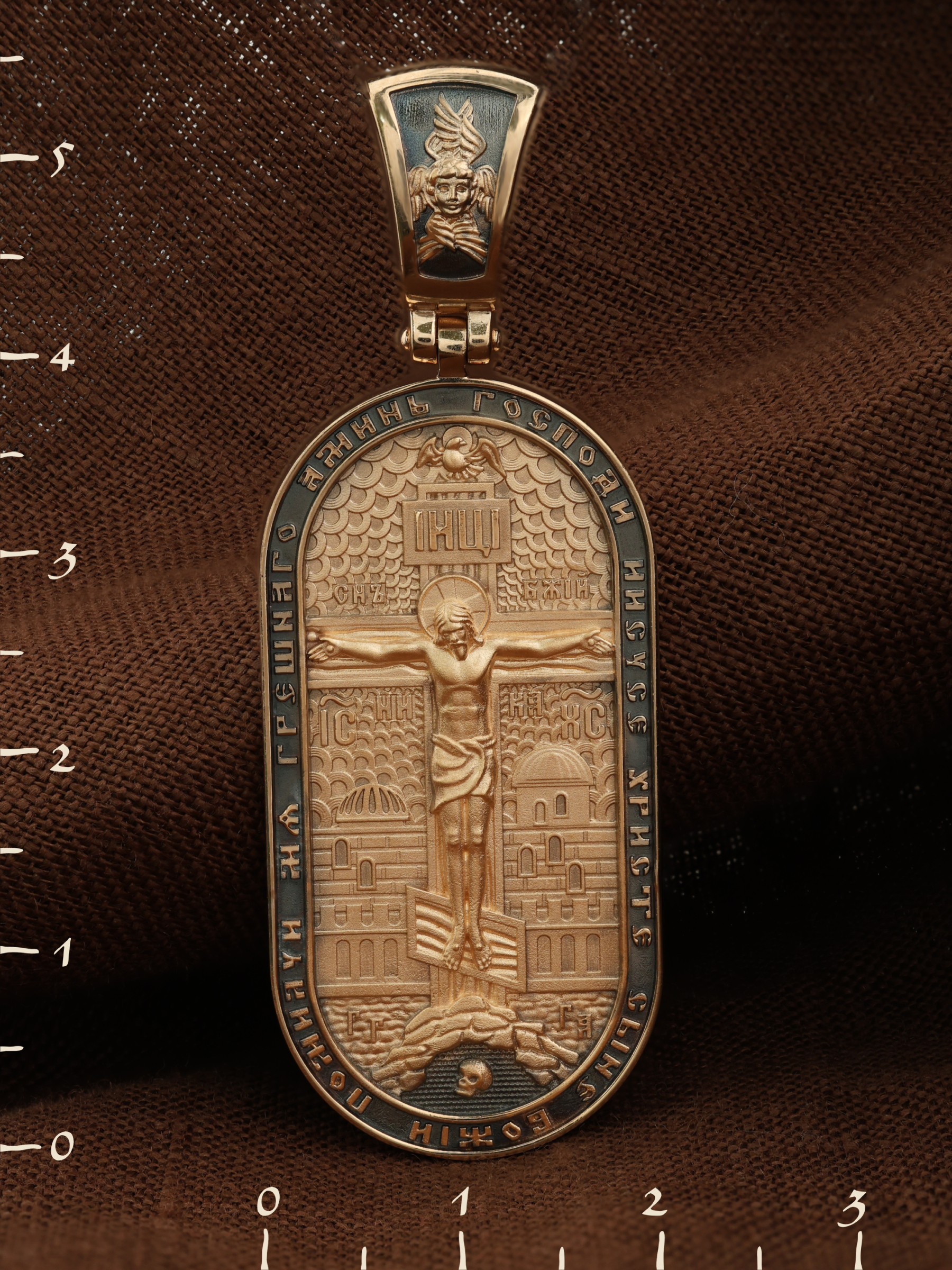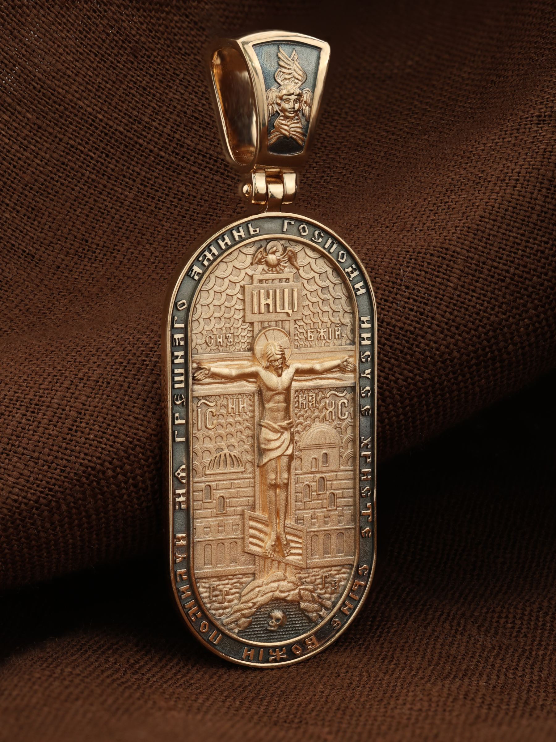 Центральную часть лицевой стороны занимает Распятие Христа — образ жертвы, принесенной Господом за грехи людей. Именно ко Христу, сошедшему на землю ради нашего спасения, возносятся все молитвы. Рядом с Его образом помещены слова — «НИКА» (греч. — Победитель) и «СЫН БОЖИЙ». Эти слова характеризуют Господа как Великого Архиерея, победителя смерти. Также Распятие сопровождается надписями, олицетворяющими Христа — это святое имя Христа «IC» (Иисус) «ХС» (Христос). Верхняя перекладина символизирует собой табличку с надписью «IHЦI» — Иисус Назарянин Царь Иудейский. Возвышение, на котором стоит Крест, символизирует гору Голгофу, на которой произошло Распятие. У подножия Креста изображают прах Адама, обозначенный черепом. На кулонном кольце изображен шестикрылый Серафим — самый приближенный к Господу Ангел. По контуру образка написана молитва: «Господи Иисусе Христе, Сыне Божий, помилуй мя грешного. Аминь»