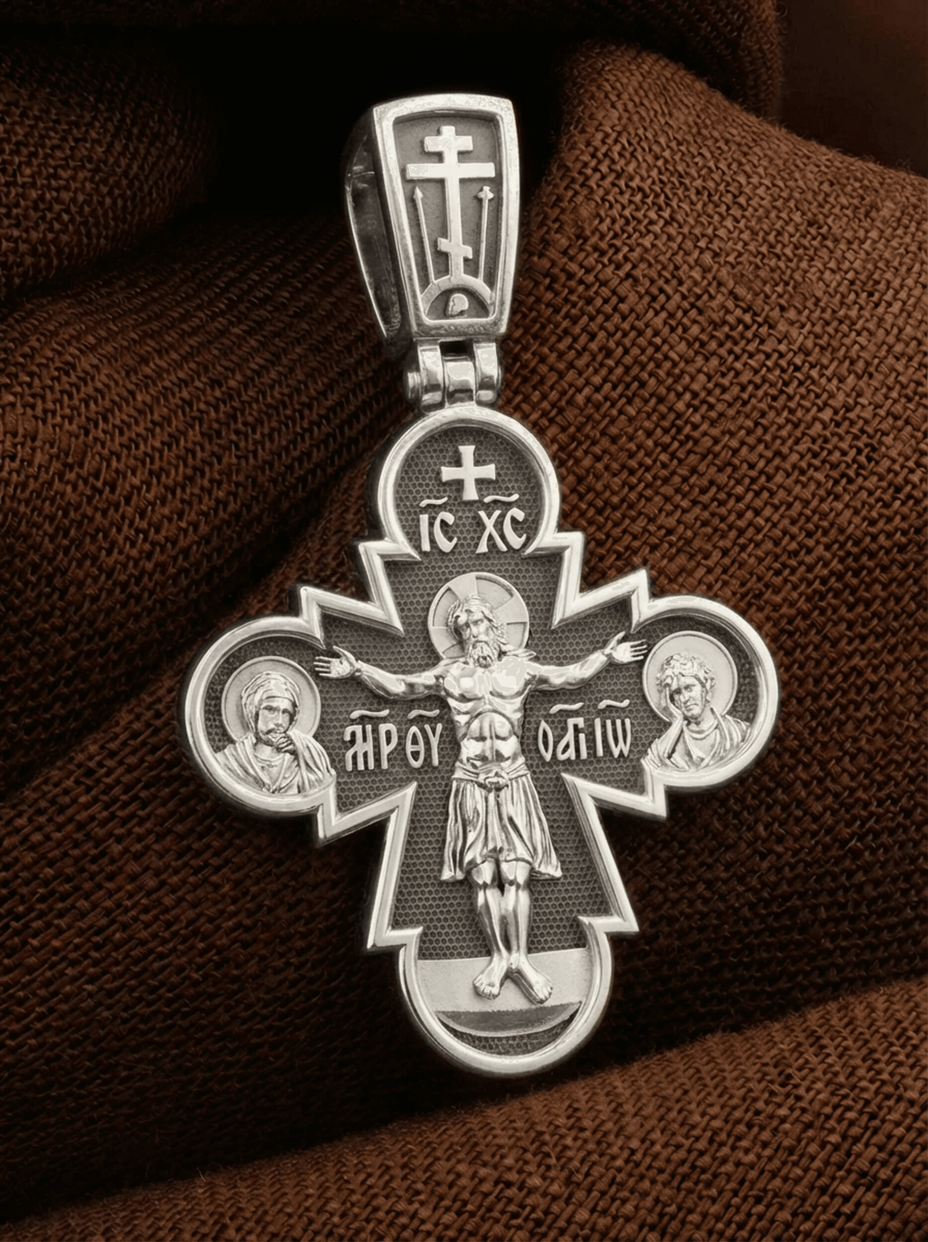 На лицевой стороне этого креста Иисус Христос является как Господь, Творец мира и его Грозный Судия, царящий на Небесах. Православная иконография показывает нам распятого Господа не в виде мучительно умирающего человека, а как величественного и всесильного Бога, который простирает руки, словно обнимает весь мир. Человеческие страдания Господа обычно только обозначаются наклоном Его головы и полузакрытыми глазами. С двух сторон Христу предстоят Пресвятая Богородица и Святой апостол и Евангелист Иоанн Богослов.