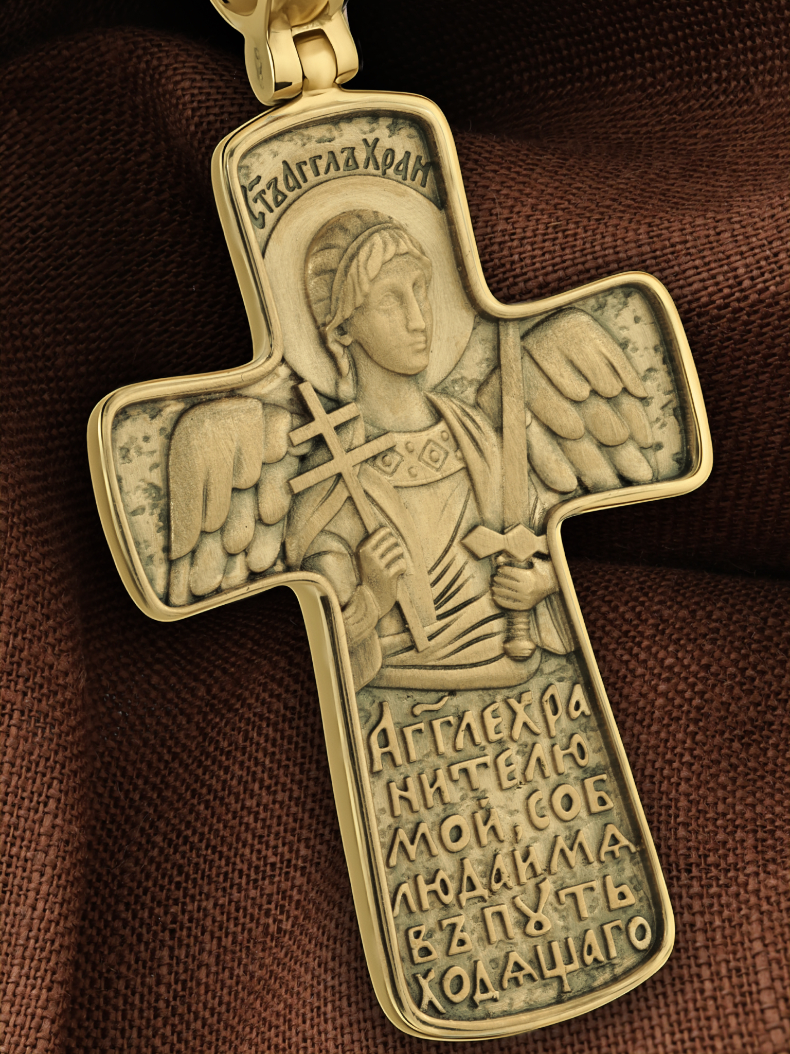 На оборотной стороне креста изображен Святой Ангел-Хранитель держащий в правой руке крест, а в левой — меч. Ангел-Хранитель — это Ангел приставляемый Богом к человеку при крещении для охраны и помощи в добрых делах. Он невидимо находится при человеке на протяжении всей его жизни, если человек сохраняет в себе любовь к Богу и истинную веру перед Ним. Ангел-Xранитель делают для нас все, что служит к истинному нашему благу и спасению. Невидимо пребывая при нас постоянно, он наставляет нас на все доброе и полезное, возносит наши молитвы к Богу, охраняют и защищают нас от врагов видимых и невидимых, ходатайствует за нас пред Богом. Ниже образа размещена молитва: «Ангеле-Хранителю мой, соблюдай мя в путь ходящего».