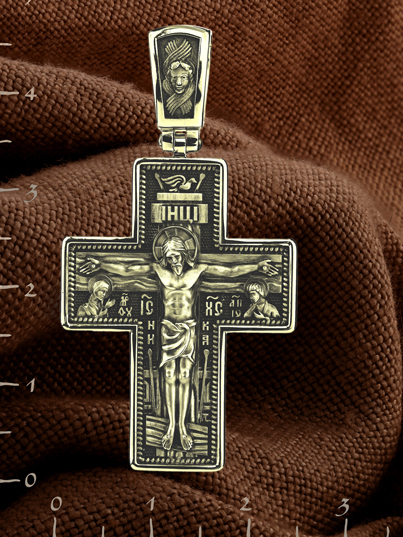 На лицевой стороне изображено Распятие Господа Иисуса Христа. С двух сторон Христу предстоят Пресвятая Богородица и св. пророк и Предтеча Господень Иоанн Креститель, которые имеют особое дерзновение перед Богом молиться за всех людей. Иконы, где они изображены молящимися Христу, называются Деисус, что значит «моление».