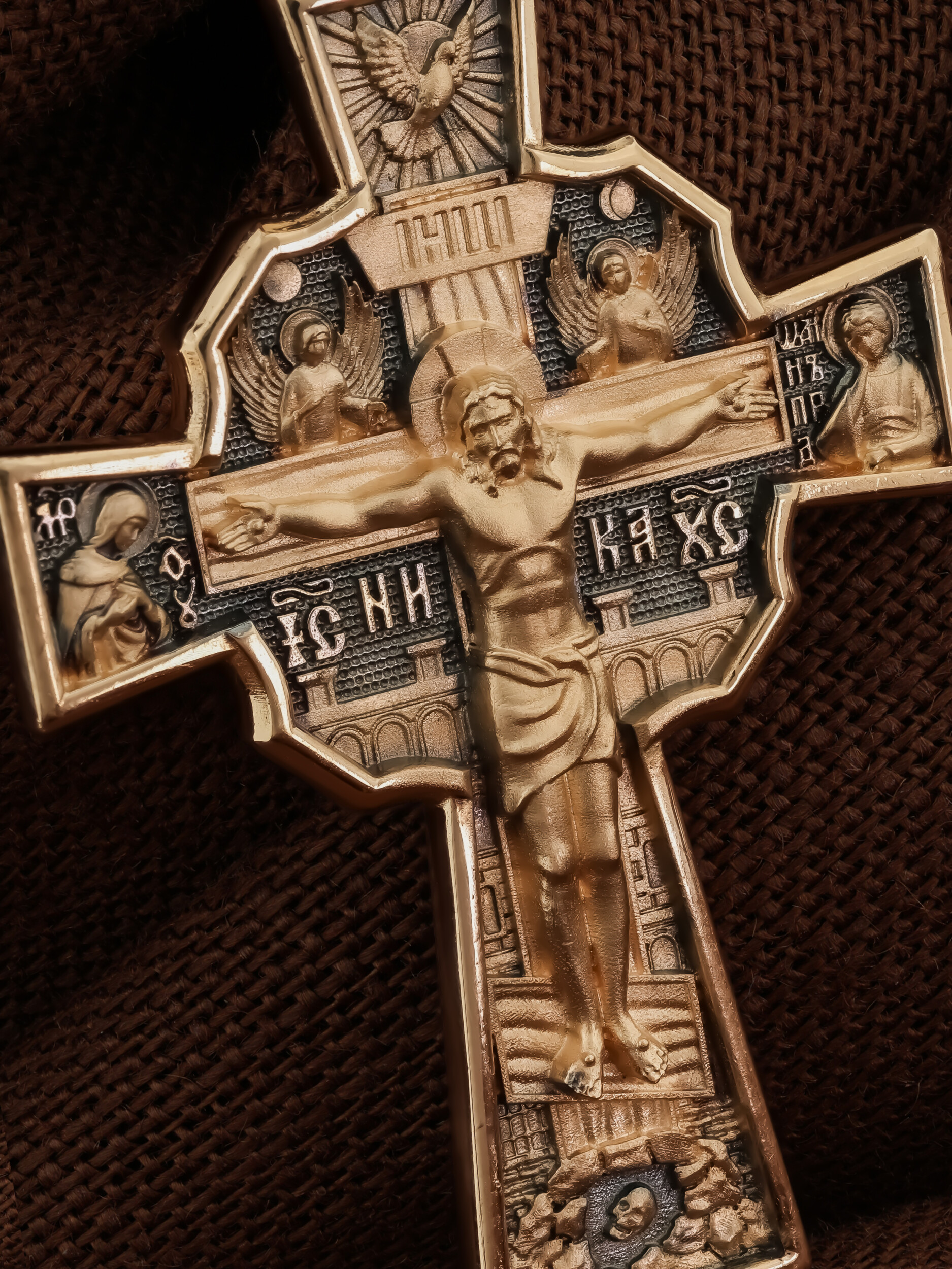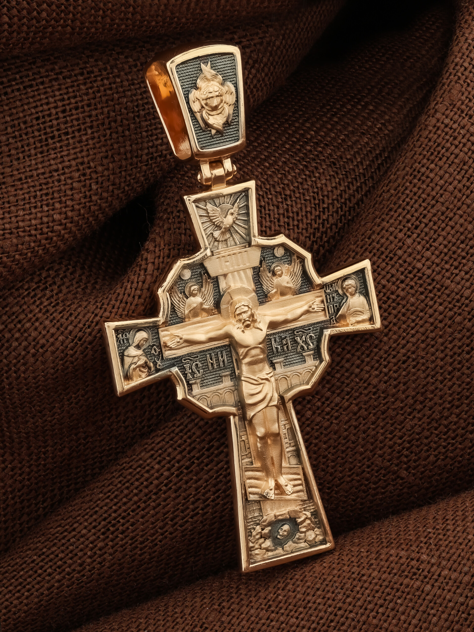 На лицевой стороне креста изображено Распятие Господа и Спасителя нашего Иисуса Христа, отдавшего Себя на смерть, для искупления грехов мира. Верхняя перекладина символизирует титло — табличку, на которой, согласно Евангелию, было начертано: Иисус Назорей Царь Иудейский (IНЦI). Распятие сопровождается надписями, олицетворяющими Христа. Надпись «IС» « ХС», что означает Иисус Христос, и слово «НИКА», что означает «победитель», помещаются ниже поперечной перекладины креста. Над вершиной Распятия помещено изображение Святого Духа, в виде голубя сходящего с небес, и двух Ангелов. Слева от Распятия изображена Пресвятая Богородица, справа — апостол и евангелист Иоанн Богослов, один из ближайших учеников Иисуса Христа. За крестом высится Иерусалимская стена, в знак того, что Господь был распят вне стен города. Возвышение, на котором стоит Крест, символизирует гору Голгофу, на которой произошло Распятие. Под подножием Креста изображена покоящаяся голова (череп) Адама. На кулонном кольце помещено изображение шестикрылого Серафим.