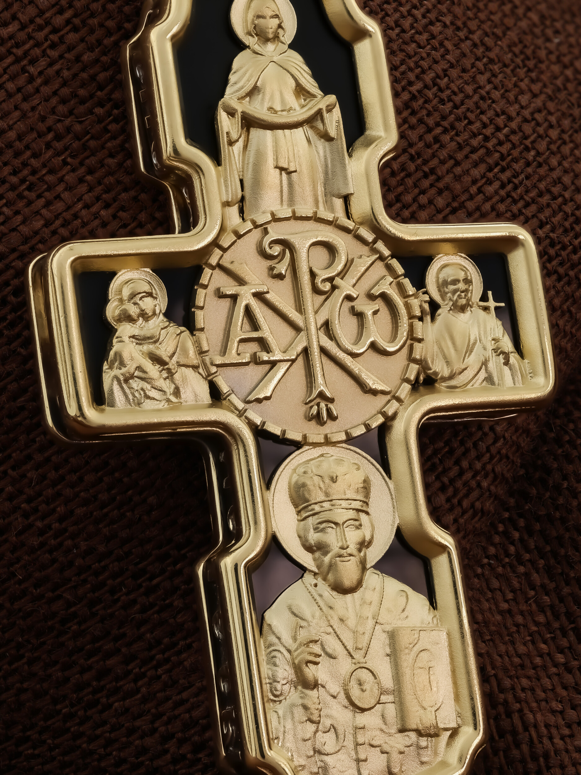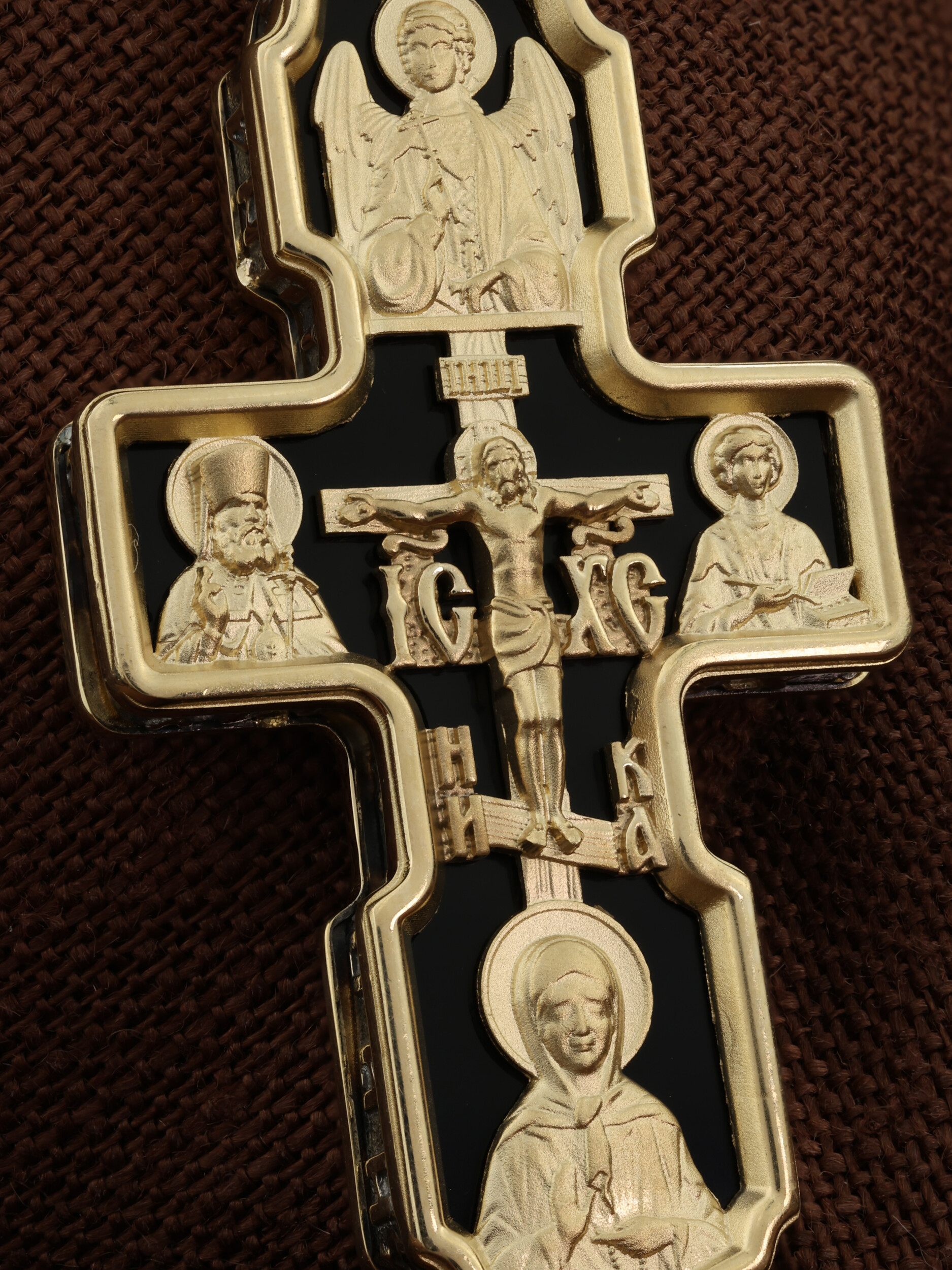 На лицевой стороне креста изображено Распятие Господа и Спасителя нашего Иисуса Христа. Христос, подвергнутый на кресте мучительной казни, своими страданиями искупил нас от древнего греха и даровал нам жизнь вечную. Без Распятия не было бы Воскресения Христова, и поэтому Крест из орудия казни обратился в святыню, в которой действует Благодать Божия. На верхней табличке, выше головы Иисуса, расположена надпись, составленная Понтием Пилатом на трех языках — «IНЦI». Она означает «Иисус Назорей, Царь Иудейский». Надпись «IС ХС» означает Иисус Христос и помещается на разных сторонах поперечной (большой) перекладины креста. На нижней перекладине находится надпись –«НИКА», что означает победитель. Над Распятием изображен Святой Ангел-Хранитель держащий крест в правой руке. Ниже Распятия — образ Святой блаженной старицы Матроны Московской. Справа — образ Свя¬того ве¬ли¬ко-му¬че¬ника и це¬ли¬теля Пан¬те¬ле¬и¬мона, а слева — образ Святителя Луки (Войно-Ясенецкого). На кулонном кольце находится надпись «ХВ», что означает Христос Воскрес. На торцевой стороне креста размещены слова Иисусовой молитвы: «Господи Иисусе Христе, Сыне Божий, помилуй мя, грешного».