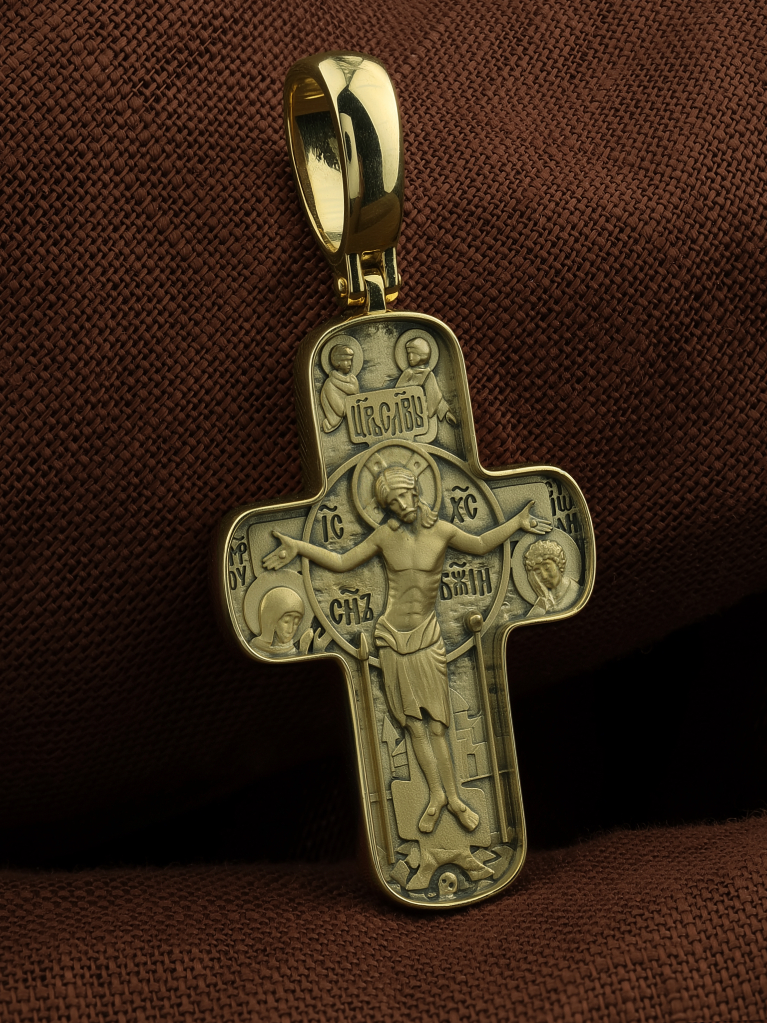 На лицевой стороне креста изображено Распятие Господа и Спасителя нашего Иисуса Христа. Христос, подвергнутый на кресте мучительной казни, своими страданиями искупил нас от древнего греха и даровал нам жизнь вечную. Без Распятия не было бы Воскресения Христова, и поэтому Крест из орудия казни обратился в святыню, в которой действует Благодать Божия. Над Распятием помещена надпись «Царь Славы». Распятие сопровождается надписями, олицетворяющими Христа: «IС» « ХС», что означает Иисус Христос и «Сын Божий». Над вершиной Распятия помещены изображения Ангелов.. Слева от Распятия изображена Пресвятая Богородица, справа — апостол и евангелист Иоанн Богослов, один из ближайших учеников Иисуса Христа. Возвышение, на котором стоит Крест, символизирует гору Голгофу, на которой произошло Распятие. Под подножием Креста изображена покоящаяся голова (череп) Адама