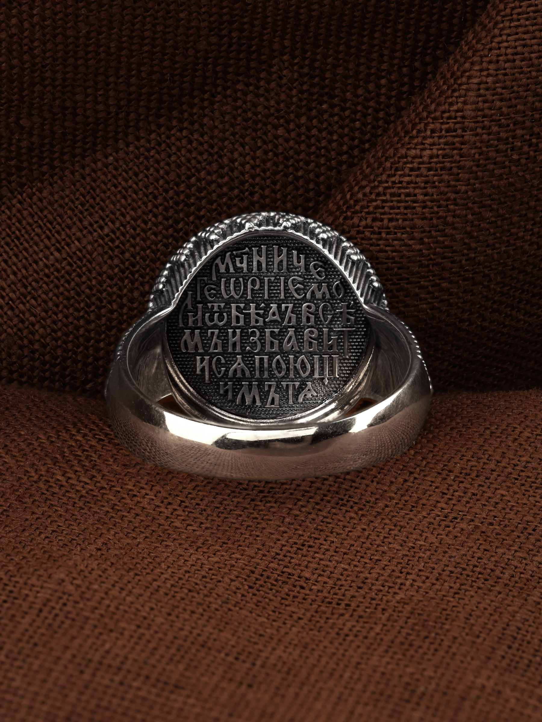 Кольцо «Святой Великомученик Георгий Победоносц» выполнено в древних христианских традициях. Основой композиции является изображение Святого Великомученика Георгия Победоносца — одного из самых почитаемых и удивительных святых. Георгий родился в Каппадокии (Малая Азия) в семье богатых и знатных горожан. Юношей поступил на службу к римскому императору Диоклетиану, за отличное знание военного дела и проявленную в боях и походах храбрость был приближен к императору и удостоен высокого воинского звания. Во время начавшихся гонений на христиан, перешел на сторону гонимых и, отвергнув человеческий страх, стал ярым проповедником учения Христа. Мучители подвергли опального воеводу жесточайшим восьмидневным пыткам и казнили его (обезглавили) в возрасте около тридцати лет в 303 году. На Руси он известен как Юрий или Егорий, заступник для верующих, чья жизнь имеет какое-либо отношение к военным делам, помощник в крестьянском труде. Георгий изображен как воитель, сидящий на вздыбленном коне и поражающий копьем огнедышащего змея. Справа над образом изображена благословляющая Божия десница. Змей символизирует собою сатанинские силы. Молитвами вознесенными к Всевышнему и своей непреклонной верой он смог одолеть чудовище. Святой убил змея, спас царскую дочь, принесенную в жертву, и жителей города, их души от влияния дьявола, породив в них надежду и веру в Господа, призывая людей принять христианскую веру.