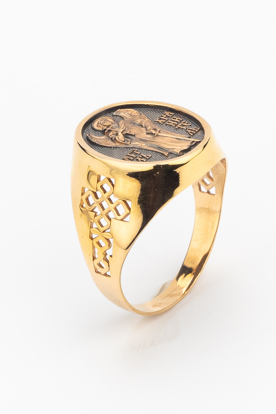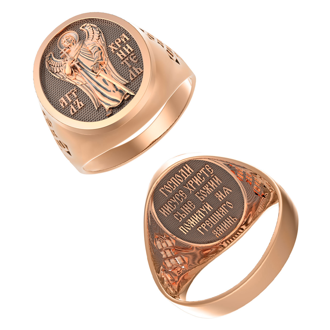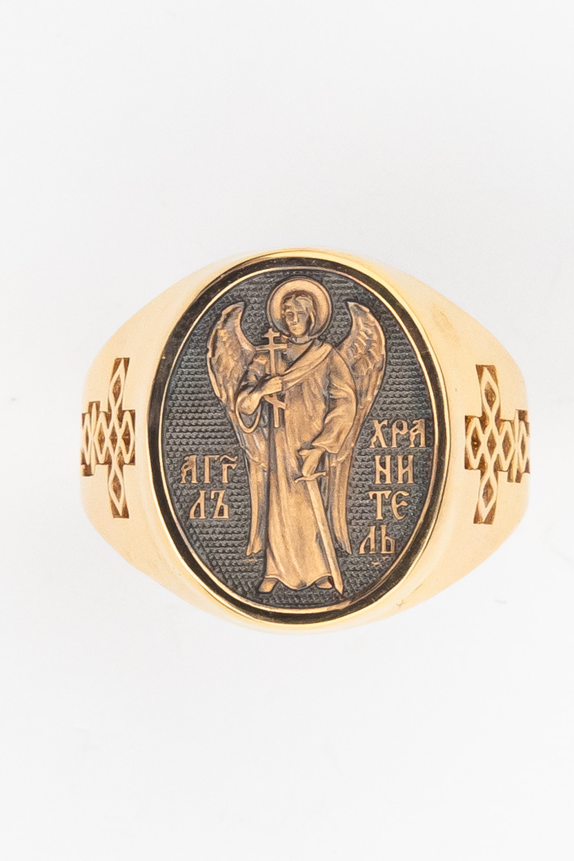 Кольцо «Святой Ангел-Хранитель " выполнено в древних христианских традициях. Ангел-Хранитель — это Ангел приставляемый Богом к человеку при крещении для охраны и помощи в добрых делах. Он невидимо находится при человеке на протяжении всей его жизни, если человек сохраняет в себе любовь к Богу и истинную веру перед Ним. Ангел-Xранитель делают для нас все, что служит к истинному нашему благу и спасению. Невидимо пребывая при нас постоянно, он, руководствуя нас ко спасению, не только по нашему желанию таинственно наставляет нас на все доброе и полезное, не только возносит наши молитвы к Богу, но еще и сам от себя охраняют и защищают нас от врагов видимых и невидимых и ходатайствует за нас пред Богом. Ангел-Хранитель так любит нас, как никто на земле любить не может. Ангел-Хранитель — присный друг наш, незримый тихий собеседник, пресладостный утешитель. Одного лишь каждому из нас он желает — спасения души; к этому он направляет все свои заботы. И если видит нас также заботящимися о спасении, радуется, если же видит нас пребывающими в нерадении о душе своей, скорбит.