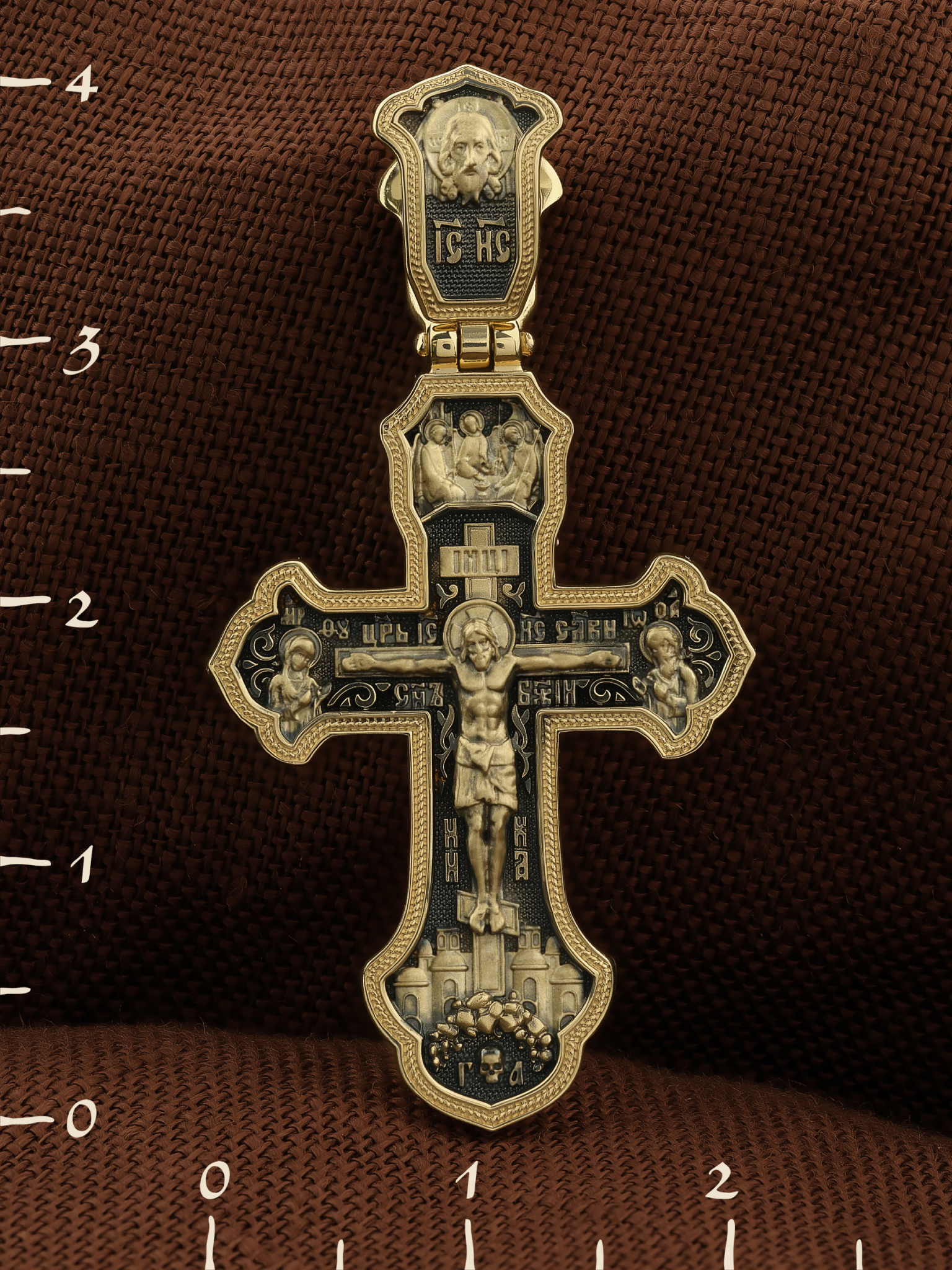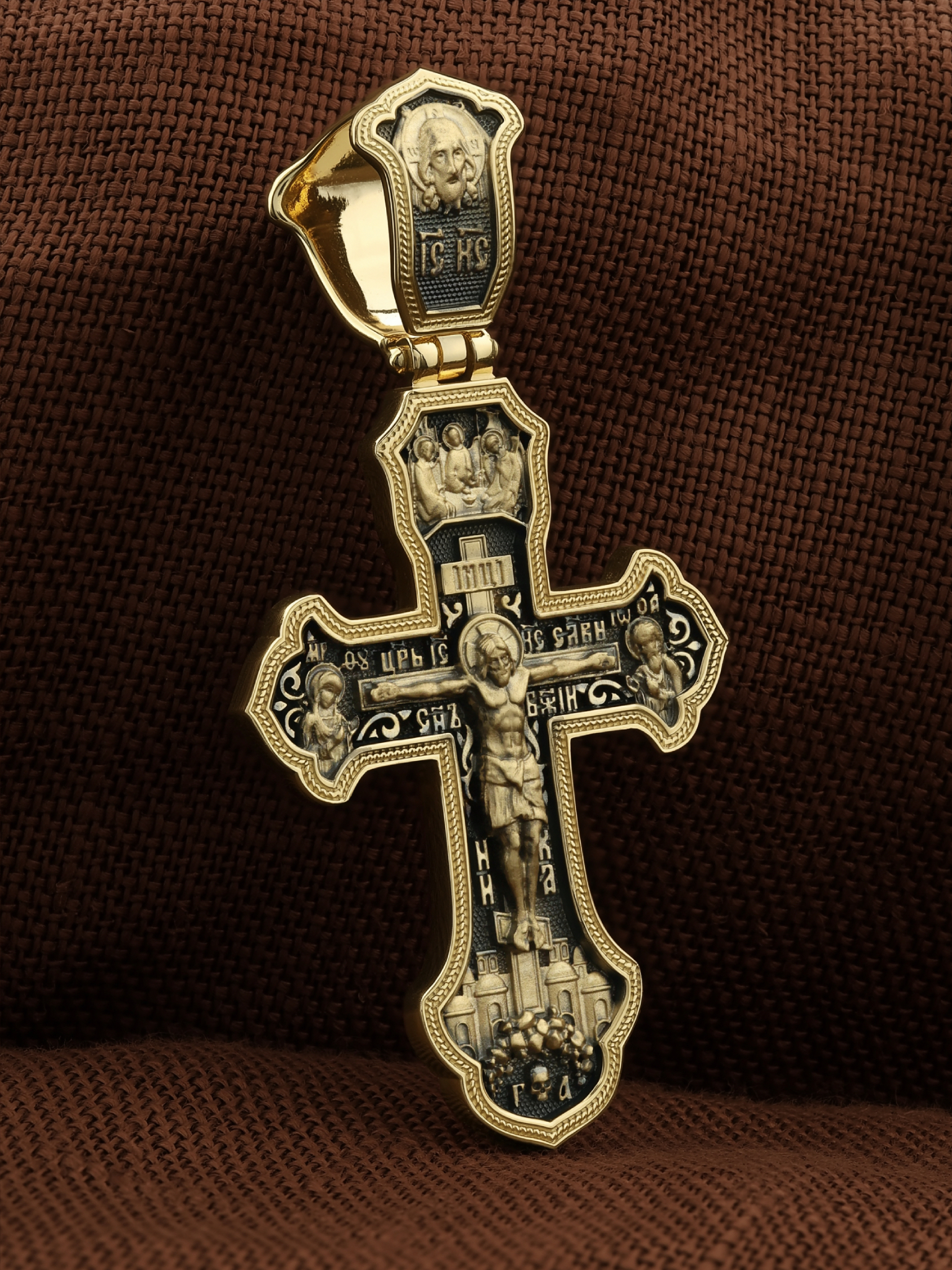 На лицевой стороне креста изображено Распятие Господа и Спасителя нашего Иисуса Христа, отдавшего Себя на смерть, для искупления грехов мира. Крест является символом жертвенной любви Всеблагого Бога к падшим людям, всепобеждающим духовным оружием христиан, основанием и средоточием церковной жизни. Господь сказал: кто хочет идти за Мною, отвергнись себя, и возьми крест свой, и следуй за Мною. (Мк. 8: 34). Над распятием помещена икона Святой Троицы, написанная преподобным Андреем Рублёвым в XV веке. На иконе изображены три ангела, являющихся образом Единосущного и Триипостасного Бога — Святой Троицы. На кулонном кольце изображен Нерукотворный образ Господа и Спасителя нашего Иисуса Христа. На верхней табличке, выше головы Иисуса, расположена надпись, составленная Понтием Пилатом — «IНЦI». Она означает «Иисус Назорей, Царь Иудейский». Надпись «IC» «ХC», означает Иисус Христос, помещается на разных сторонах поперечной перекладины креста. Рядом — слово «НИКА», что означает «победитель» и надпись «Царь Славы». Слева от Распятия изображена Пресвятая Богородица, справа — Про-рок Предтеча и Креститель Господень Иоанн. Ниже расположена надпись «Сын Божий». За крестом высится Иерусалимская стена, в знак того, что Господь был распят вне стен города. Крест стоит на горе камней, символизирующих Голгофу. В ее основании различается череп– это голова Адама.