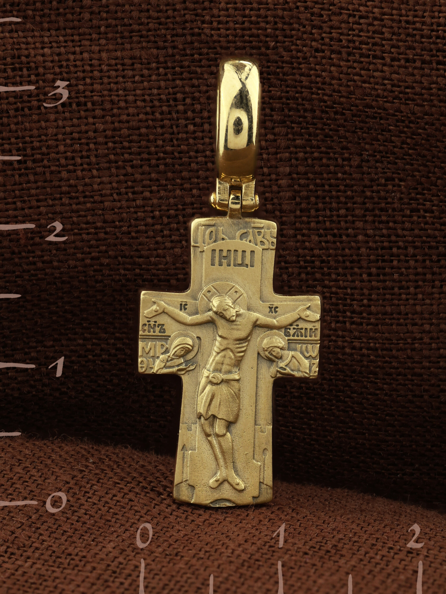 На лицевой стороне креста изображено Распятие Господа и Спасителя нашего Иисуса Христа, отдавшего Себя на смерть, для искупления грехов мира. Крест является символом жертвенной любви Всеблагого Бога к падшим людям, всепобеждающим духовным оружием христиан, основанием и средоточием церковной жизни. Над вершиной Распятия помещена надпись «Царь Славы». На верхней табличке, выше головы Иисуса, расположена надпись, составленная Понтием Пилатом — «IНЦI». Она означает «Иисус Назорей, Царь Иудейский». Распятие сопровождается каноническими надписями. Надпись «IC» «ХC», означает Иисус Христос и словосочетание «СЫН БОЖИЙ», что означает божественную природу Иисуса Христа, помещаются на разных сторонах поперечной перекладины креста. Слева от Распятия изображена Пресвятая Богородица, справа — апостол и евангелист Иоанн Богослов, один из ближайших учеников Иисуса Христа. Вдоль креста изображены копие сотника Лонгина и трость с губкой. За Распятием высится Иерусалимская стена, в знак того, что Господь был распят вне стен города.
