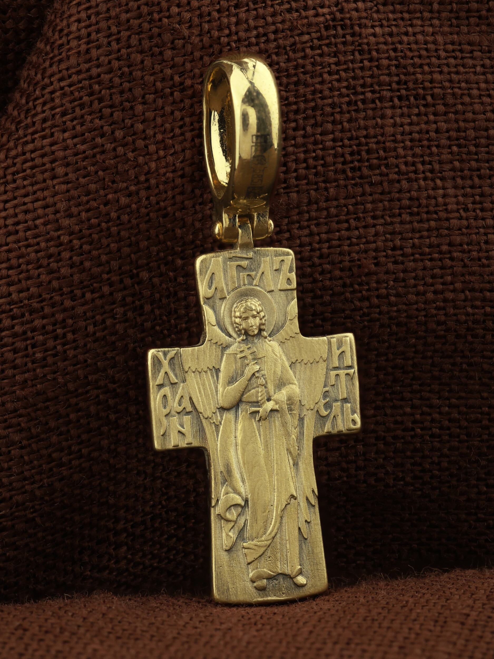 На оборотной стороне креста изображен Святой Ангел-Хранитель. Это Ангел приставляемый Богом к человеку при крещении для охраны и помощи в добрых делах. Он невидимо находится при человеке на протяжении всей его жизни, если человек сохраняет в себе любовь к Богу и истинную веру перед Ним. Ангел-Xранитель делают для нас все, что служит к истинному нашему благу и спасению. Невидимо пребывая при нас постоянно, он наставляет нас на все доброе и полезное, возносит наши молитвы к Богу, охраняют и защищают нас от врагов видимых и невидимых, ходатайствует за нас пред Богом.