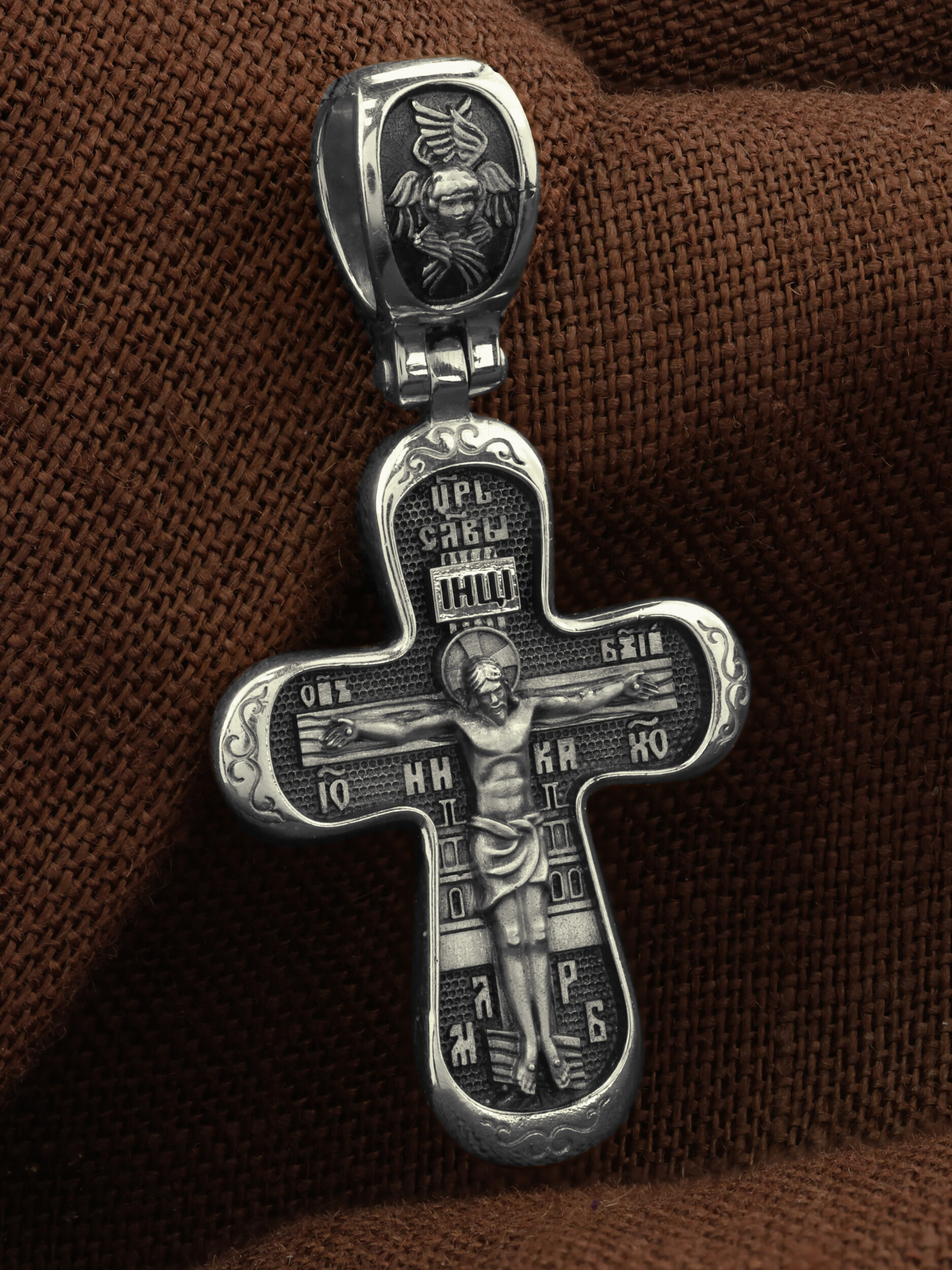 На обороте креста изображена икона Покрова Пресвятой Богородицы. Праздник Покрова Божией Матери является воспоминанием чуда, которое произошло во Влахнернской церкви 1 (14) октября 910 года: Пресвятая Богородица явилась верующим над алтарем храма и распростерла над ними Свое покрывало. В этот день Божья Матерь открыла людям, что Она является Ходатаицей за них перед Богом. Богородица простирает Свой молитвенный покров над всеми православными христианами и умоляет Сына Своего о даровании вечного спасения каждому человеку. На кулонном кольце изображен Спас Нерукотворный — Символ вочеловечившегося Божества и шестикрылый Серафим — самый приближенный к Господу Ангел.
